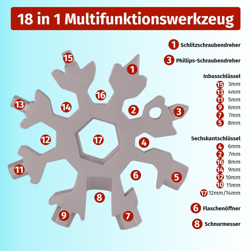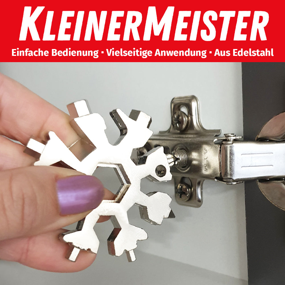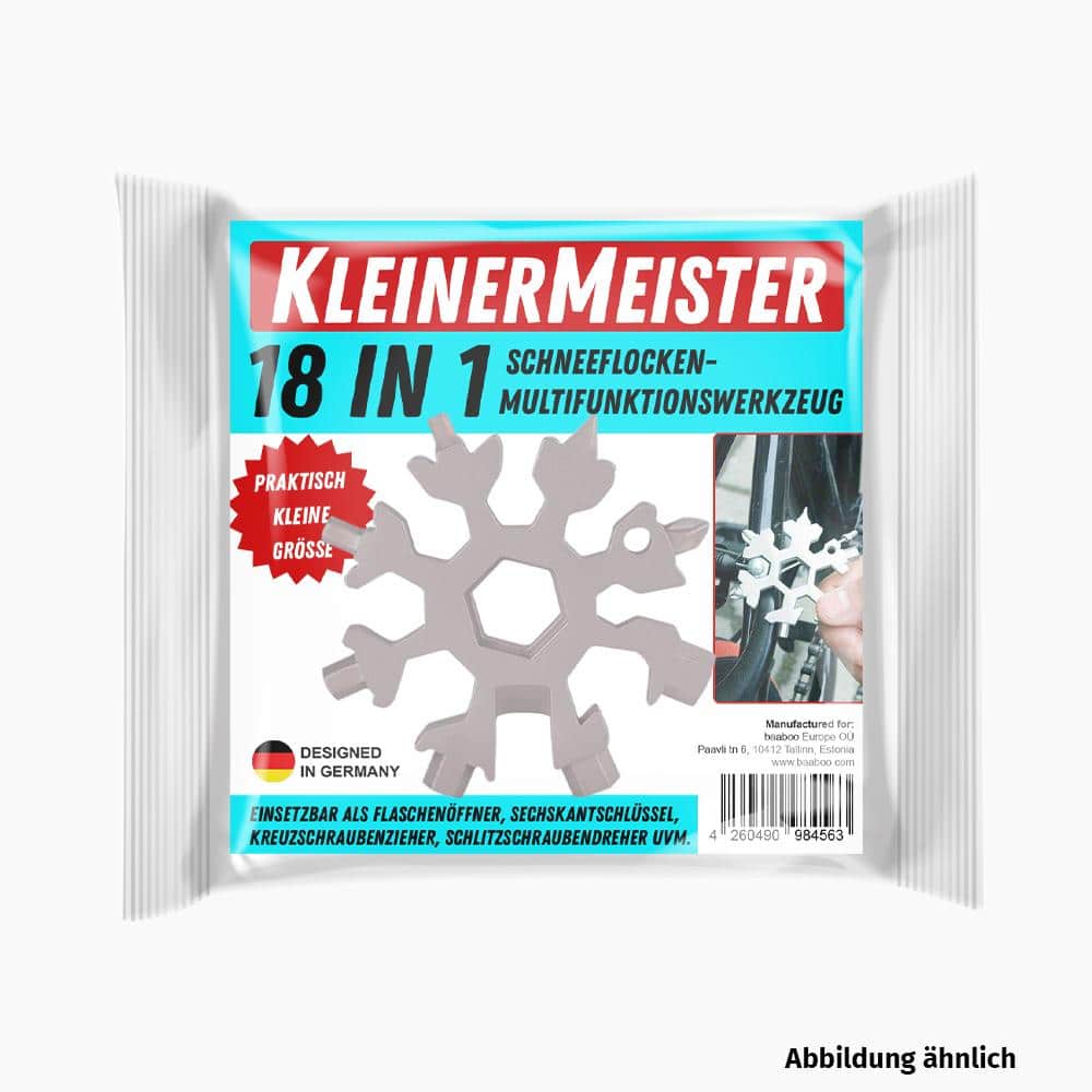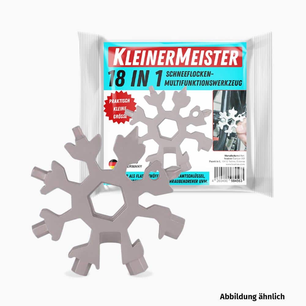 Der KleinerMeister 18-in-1 Schneeflocken Multifunktionswerkzeug ist ein Mehrfachwerkzeug in praktisch kleiner Größe. Das einzigartige Schneeflockendesign macht das Werkzeug besonders attraktiv und kann so auch am Schlüsselbund oder Rucksack angebracht und aufbewahrt werden. Es besteht aus Edelstahl und rostet nicht so schnell, weshalb es durchaus Outdoor geeignet ist. Insgesamt verfügt es über 18 Tools. Einsetzbar als Schlüsselring, Flaschenöffner, Sechskantschlüssel, Kreuzschraubenzieher, Schlitzschraubendreher uvm. Die Anwendungsgebiete sind vielseitig vom Schrauben anziehen über Flaschen und Verschlusskappen öffnen oder Reparieren von Spielzeugen, Fahrrädern etc.