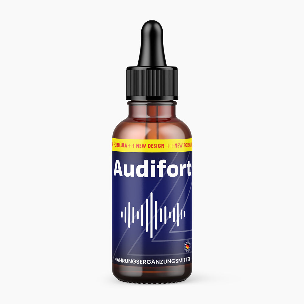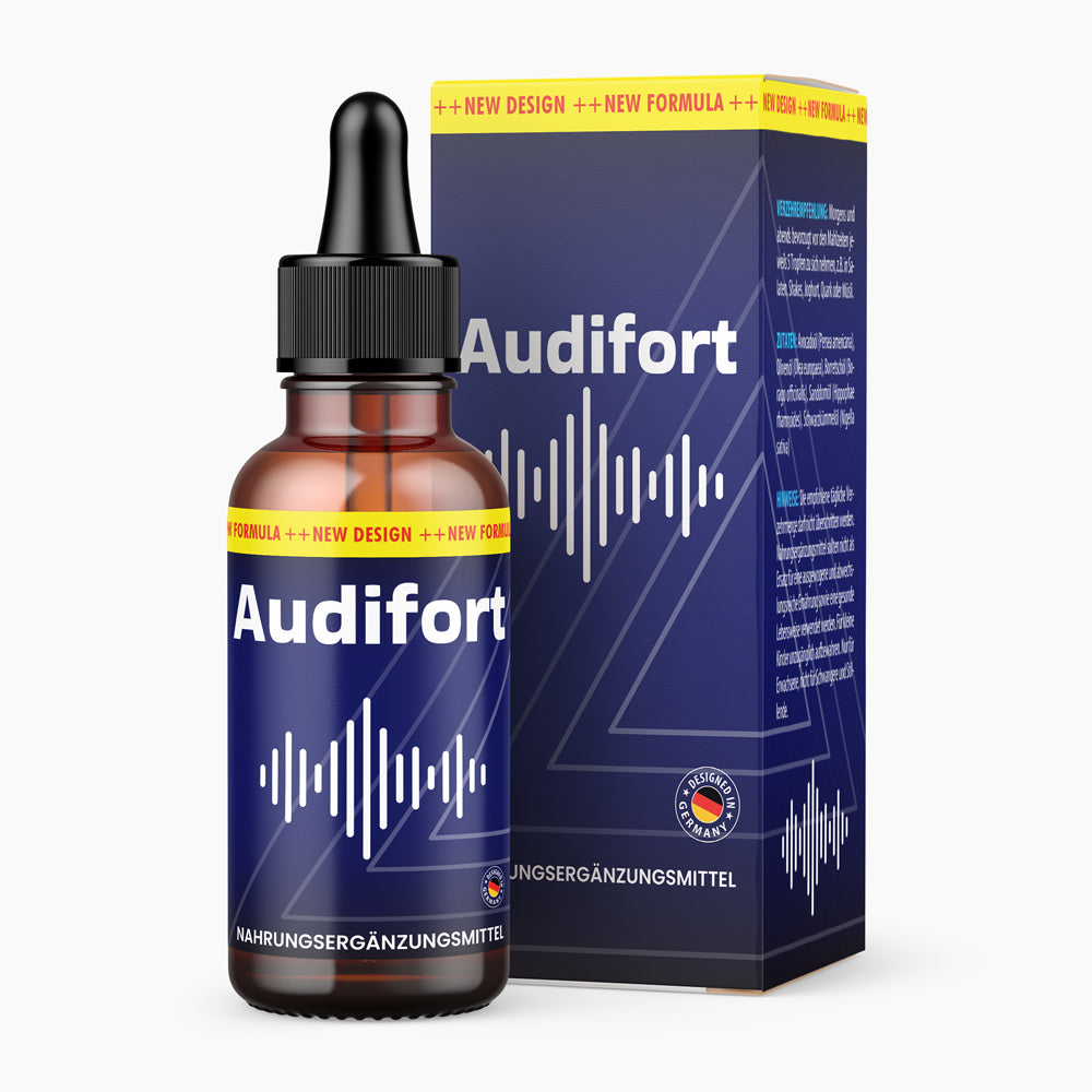 Braune Flasche mit Pipette und Schrift Audifort, blaues Etikett mit Schallwellen vor passender Faltschachtel