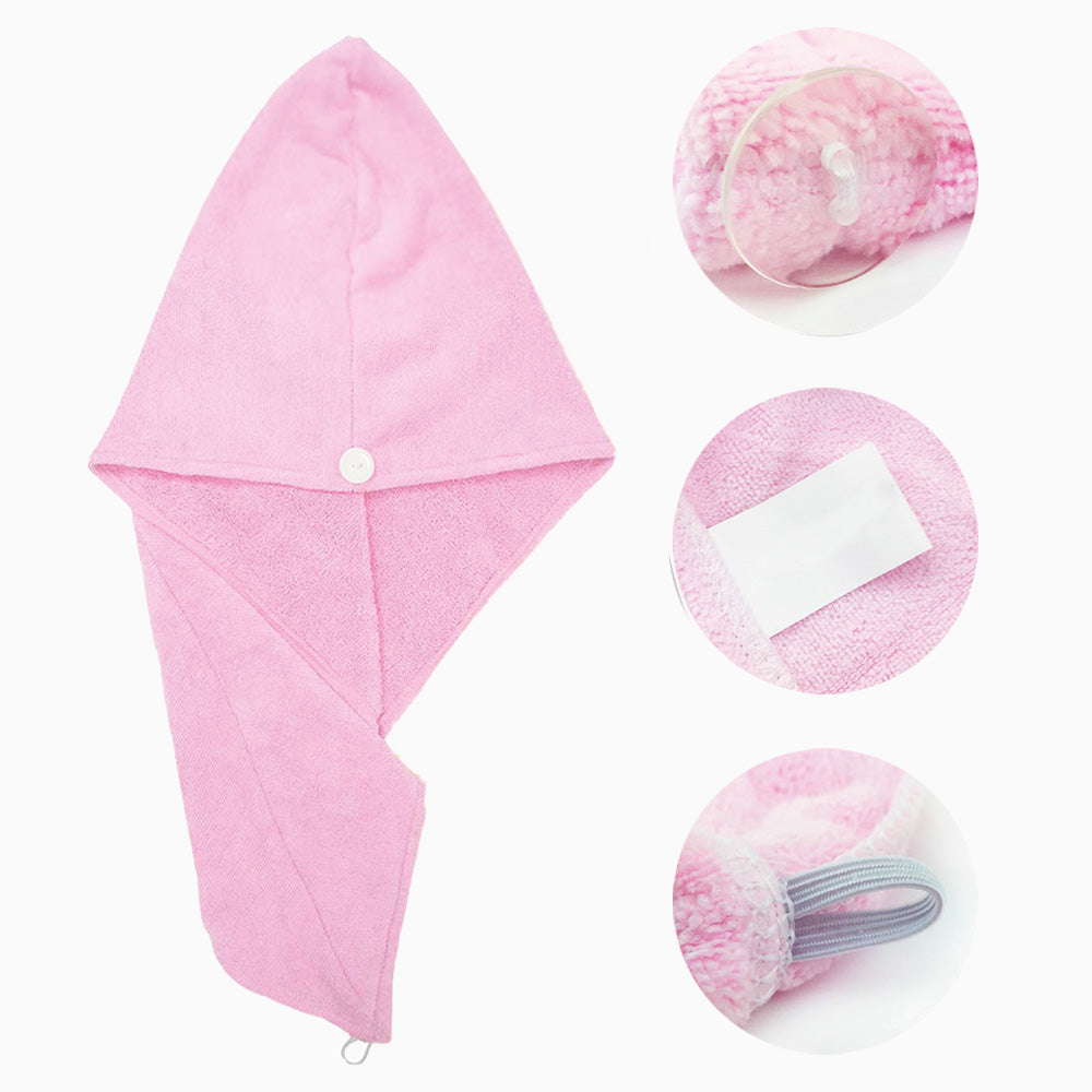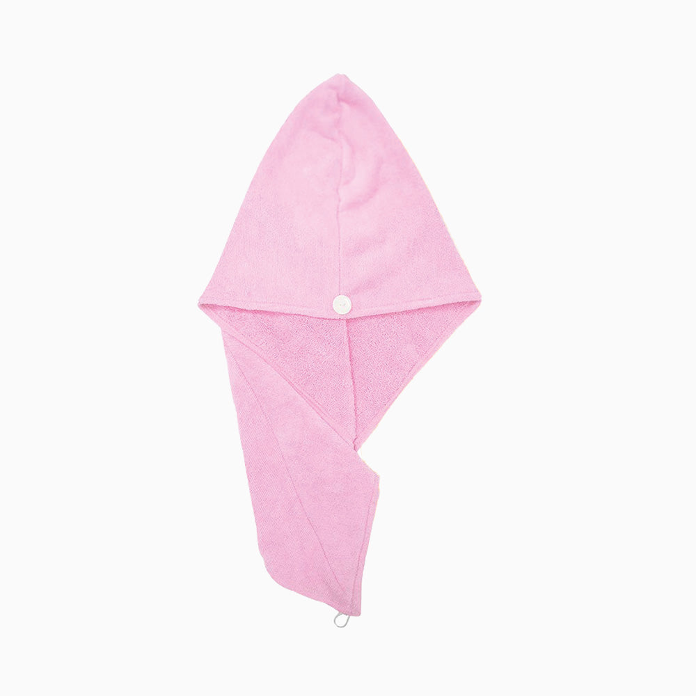 Rosa Handtuch in turbanartiger Form mit mittigem Knopf und Schlaufe am unteren Ende