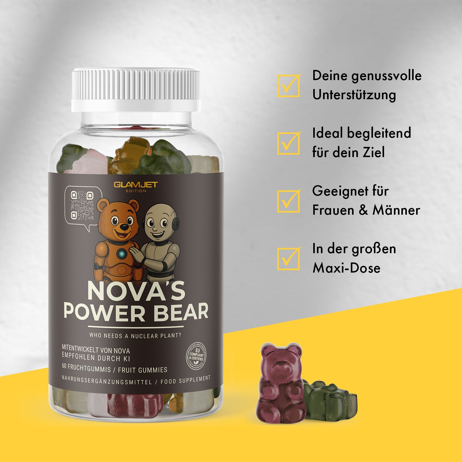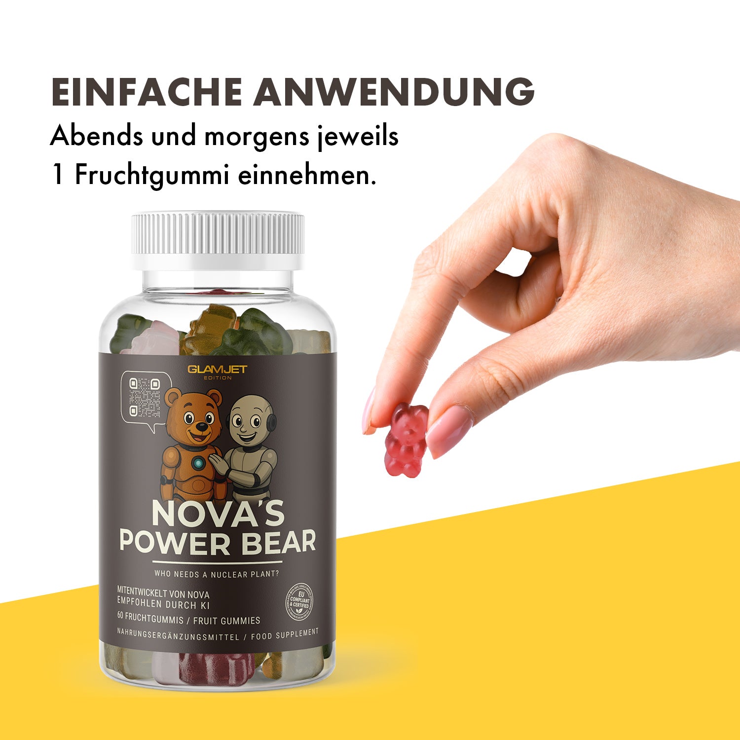 Nova’s Power Bear ist ein innovatives Nahrungsergänzungsmittel in leckerer Fruchtgummi-Form – mit wertvollen Pflanzenextrakten wie Grüntee, Maca, Guarana und Ingwer. Die Rezeptur wurde gezielt für den modernen Alltag entwickelt: Natürlich, gezielt abgestimmt auf moderne Bedürfnisse und mit einem Hauch künstlicher Intelligenz in der Konzeption – denn smarte Entscheidungen fangen bei dir an.
