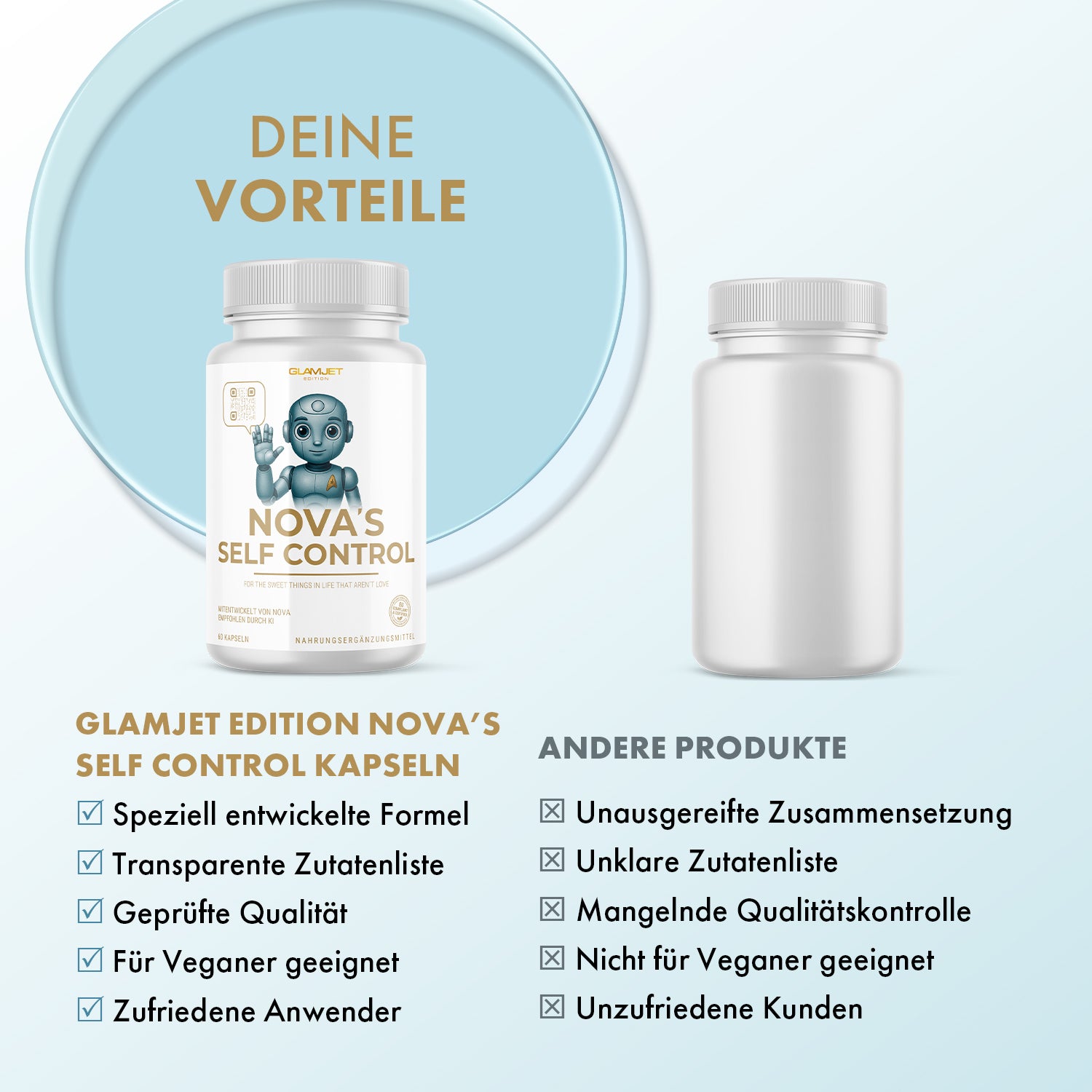Ein Blick auf die Zutatenkombination von Glamjet Edition Nova’s Self Control zeigt, dass das Präparat eine sehr gute Verträglichkeit aufweist. Das liegt an den natürlichen Inhaltsstoffen, die nur in den seltesten Fällen zu unerwünschten Nebenwirkungen führen.