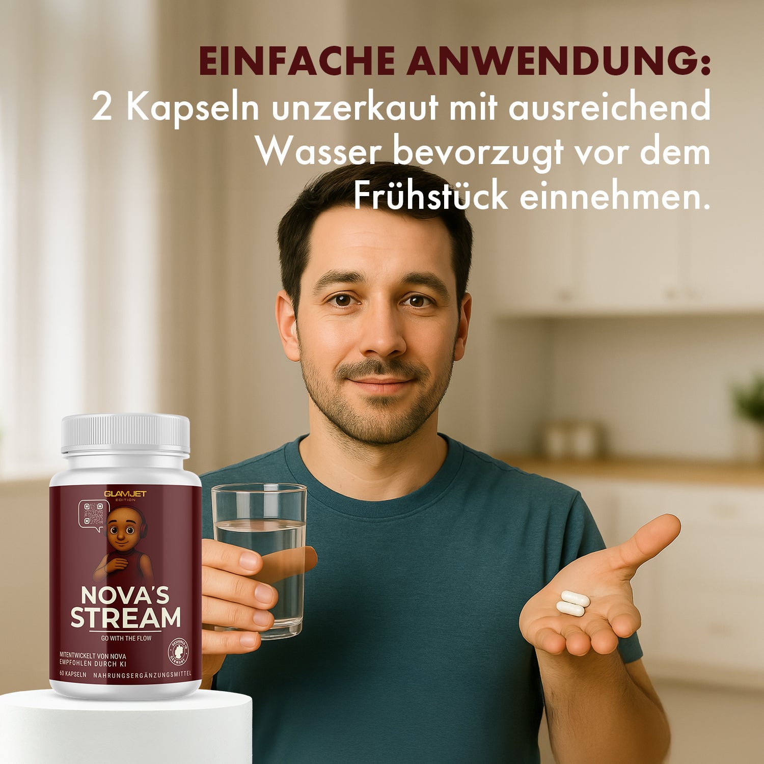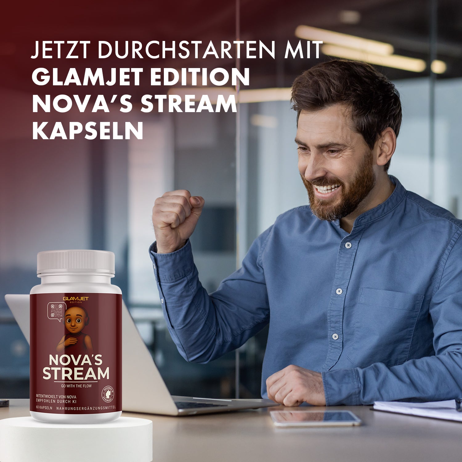 Glamjet Edition Nova’s Stream ist mehr als nur ein Nahrungsergänzungsmittel – es ist das Ergebnis einer Verbindung aus bewährten Naturstoffen und moderner Produktentwicklung. Inspiriert durch traditionelle Pflanzenkraft und unterstützt durch KI-gestützte Rezepturoptimierung bietet diese Kapsel-Kombination eine durchdachte Ergänzung für deinen Alltag.