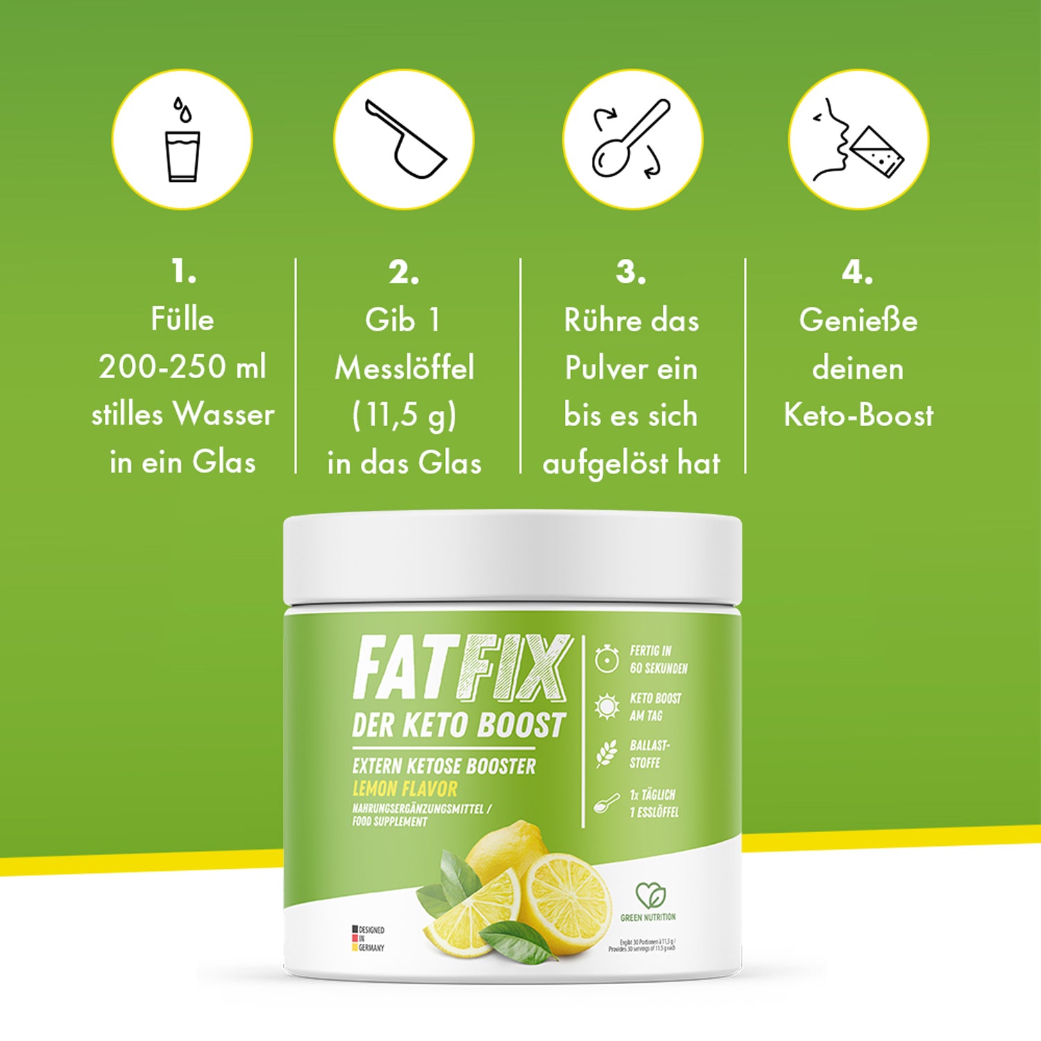 In einer Dose FATFIX Keto Boost sind rund 345 g Exogene Ketone Pulver. Bei korrekter Anwendung und Dosierung, kannst Du aus dieser Dose insgesamt 30 Portionen machen.