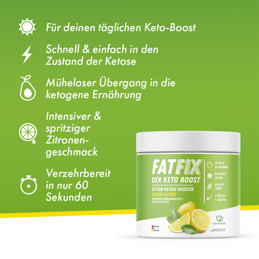 Möchtest Du deine Ketose beschleunigen bzw. einfacher gestalten oder suchst Du eine sinnvolle Unterstützung bei einer ketogenen Ernährung? Mit FATFIX Keto Boost, dem Trinkpulver mit exogenen Ketonen, hast Du einen solchen Helfer gefunden! Entwickelt, um dir auf dem Weg zur Ketose zu helfen, kombiniert FATFIX Keto Boost hochwertige Zutaten, Geschmack und Nutzen in einem Produkt.